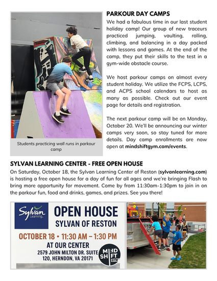 On Saturday, October 18, the Sylvan Learning Center of Reston (sylvanlearning.com) is hosting a free open house for a day of fun for all ages and we’re bringing Flash to bring more opportunity for movement. Come by from 11:30am-1:30pm to join in on the parkour fun, food and drinks, games, and prizes. See you there!
