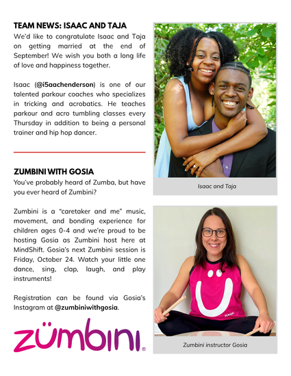 You’ve probably heard of Zumba, but have you ever heard of Zumbini? Zumbini is a “caretaker and me” music, movement, and bonding experience for children ages 0-4 and we’re proud to be hosting Gosia as Zumbini host here at MindShift. Gosia’s next Zumbini session is Friday, October 24. Watch your little one dance, sing, clap, laugh, and play instruments!