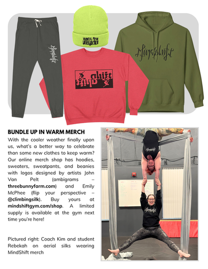 With the cooler weather finally upon us, what’s a better way to celebrate than some new clothes to keep warm? Our online merch shop has hoodies, sweaters, sweatpants, and beanies with logos designed by artists John Van Pelt (ambigrams – threebunnyfarm.com) and Emily McPhee (flip your perspective – @climbingsilk).